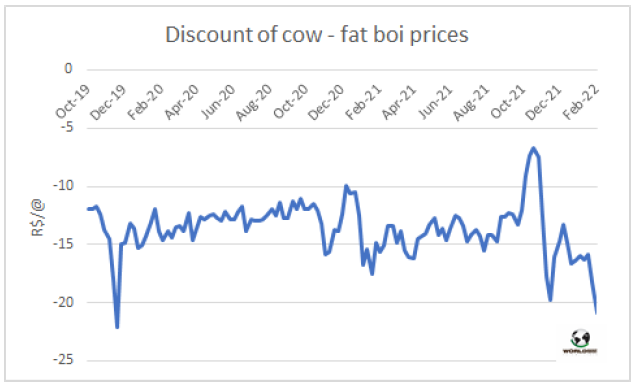 由于對中國出口的緊迫需求使可以出口到中國的30月齡以下的小公牛價格與母牛價格的價差拉大。圣保羅州可以對中國出口的小公牛采購價要高出15雷亞爾/15公斤。反過來,育肥母牛與育肥公牛之間的價格差擴大到20雷亞爾/15公斤,這是自2019年11月以來的最大差距,當時對中國出口也有非常強烈的需求。相反,當巴西暫停對中國的出口時,母牛與公牛之間的價格差距縮小到8雷亞爾/15公斤。一周內,育肥牛價格小幅下調,而批發(fā)市場后部位肉價格保持穩(wěn)定,而前部位肉價格則有所上漲。