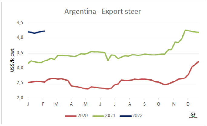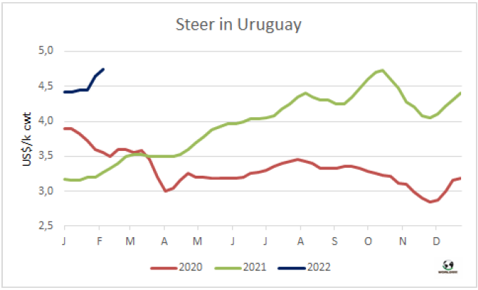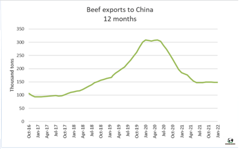 1月烏拉圭對中國的平均出口價格5931美元/噸,比12月的平均價格低43美元。烏拉圭對中國平均出口額連續(xù)11個月的增長畫上句號。2022年1月的平均價格同比增長了49%,這是由于不同部位肉價格的上漲,去骨部位肉相對于帶骨牛肉的占比更大。今年1月,烏拉圭對中國牛肉出口量占總出口量的76%,其中冷凍牛肉對中國出口量占總冷凍牛肉出口量的82%。根據海關出口數據,1月烏拉圭牛肉出口量33167噸,平均價格為6455美元/噸。盡管出口量較去年12月的峰值下降了20%,但仍比2021年1月高27%。