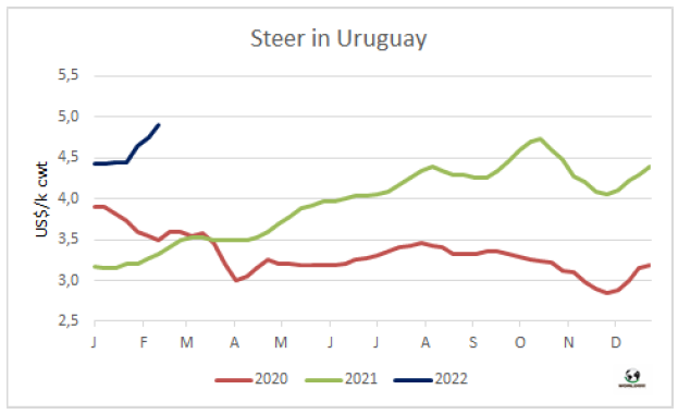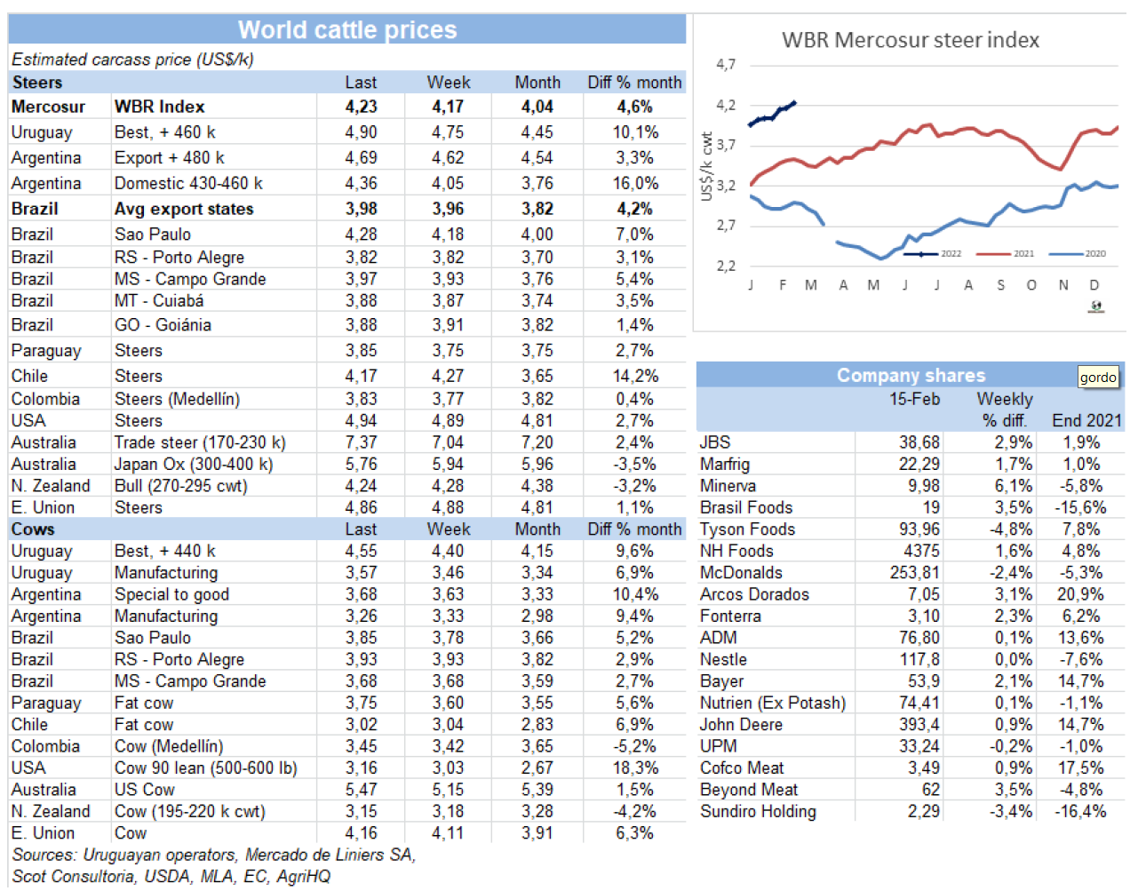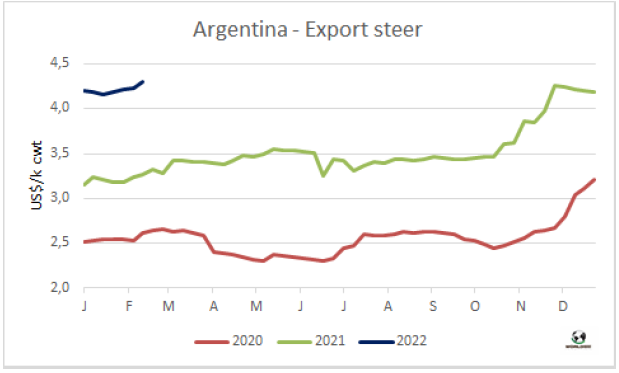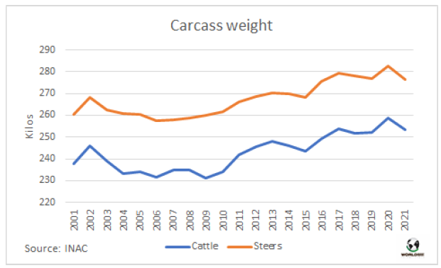 根據(jù)ABC出口商會(huì)的一份報(bào)告,去年待宰牛平均體重有所增加:母牛平均胴體重量為每頭210公斤,公牛的平均胴體重量為每頭246公斤,均高于2020年數(shù)據(jù)。對(duì)于ABC來(lái)說(shuō),由于“穆尼屠宰量減少和較輕動(dòng)物數(shù)量減少”,平均體重為每頭228公斤,比2020年增長(zhǎng)了2公斤。2022年的第一個(gè)月,這一數(shù)值再次被超越,達(dá)229公斤,盡管報(bào)告稱(chēng)這 “與我們的競(jìng)爭(zhēng)對(duì)手相比仍有很大差距”。