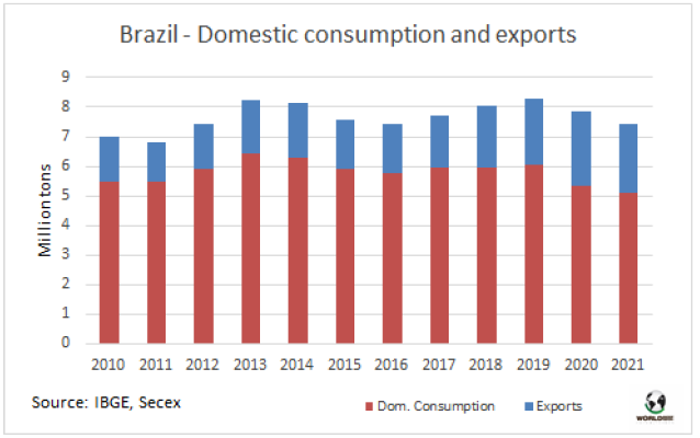 2021年巴西牛肉產(chǎn)量的減少對(duì)出口和國(guó)內(nèi)消費(fèi)均產(chǎn)生影響。據(jù)估計(jì),巴西去年人均牛肉消費(fèi)量509萬(wàn)噸(胴體重量),比2020年減少了27萬(wàn)噸(-5.1%),是自2009年以來(lái)的最低水平。這一數(shù)字是基于IBGE發(fā)布的生產(chǎn)數(shù)據(jù)和外貿(mào)部的對(duì)外貿(mào)易數(shù)據(jù)報(bào)告。相反,如果考慮到人口的變化,檢驗(yàn)機(jī)構(gòu)注冊(cè)的合規(guī)屠宰場(chǎng)(聯(lián)邦、州或市)生產(chǎn)的牛肉的人均消費(fèi)量是自2004年以來(lái)首次降至24公斤以下。由于暫停對(duì)中國(guó)出口,今年最后一個(gè)季度的出口量急劇下降,這意味著海外銷(xiāo)售較去年的下降比例要大于國(guó)內(nèi)市場(chǎng)。出口量減少了7.0%至234萬(wàn)噸,同比減少18萬(wàn)噸(胴體重量)?!?span>