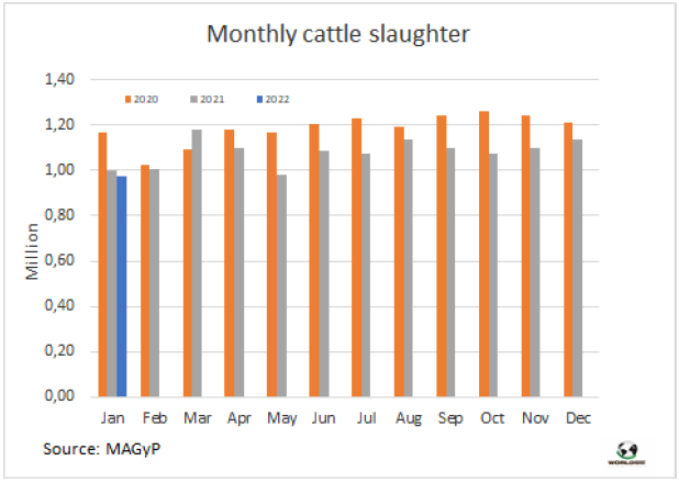 1月阿根廷牛屠宰量約97.2萬(wàn)頭,較上月下降了14%,較去年1月下降了3%。2021年五月牛肉出口因罷工被禁時(shí)的屠宰量沒(méi)有低于上月。2021年2月至2022年1月牛屠宰量達(dá)1284萬(wàn)頭,同比下降了7%,母牛的比例為45%。