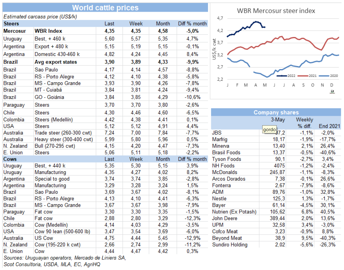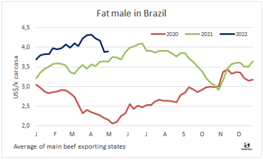 巴西育肥牛價格連續(xù)七周下跌后,市場達到了新的平衡。最近一周價格僅下跌了1雷亞爾/15公斤,主要出口州育肥牛價格參考價291雷亞爾/15公斤。需求方面,在周末母親節(jié)的額外需求的加持下,圣保羅批發(fā)市場銷售情況不錯。草飼牛的供應(yīng)增長,給市場帶來了一些壓力,預(yù)計五月前兩周市場將保持穩(wěn)定。