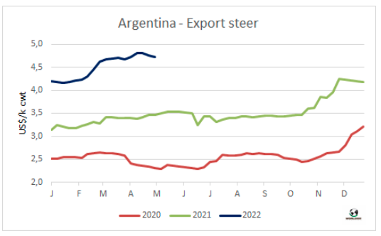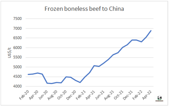 4月冰鮮牛肉對歐盟的平均出口價格達14179美元/噸,環(huán)比上漲了12%,達自2011年11月10多年以來的最高水平。這一平均價格反映了希爾頓配額內(nèi)的產(chǎn)品價格漲幅較大,而481配額內(nèi)出貨的產(chǎn)品漲幅相對緩和,占比小,平均價格較低。2022年前4個月,發(fā)往歐盟的冰鮮牛肉的平均價格為11893美元/噸,比2021年同期增長了32%。