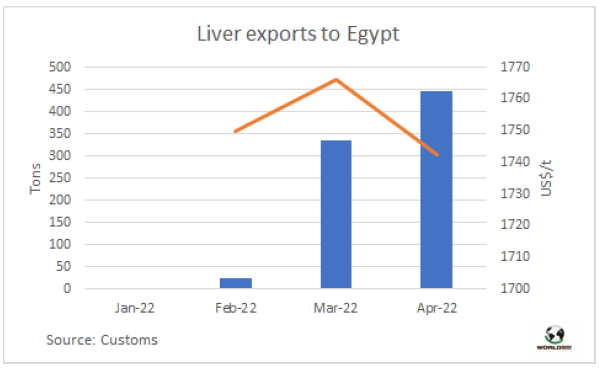 由于西方對俄羅斯的制裁,對俄出口貿(mào)易困難,促進了烏拉圭牛肝對埃及的出口。三月烏拉圭對埃及牛肝出口量336噸,四月對埃及牛肝出口量445噸,出口平均價格在1750美元/噸波動。同時對俄羅斯銷售仍處在低水平,1月和2月對俄羅斯銷售超過400噸,3-4月貿(mào)易量下降至28噸,平均價格與埃及市場價格差不多。