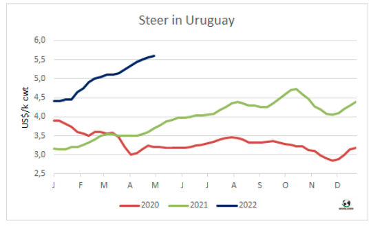 四月烏拉圭牛肉出口量34175噸,平均出口價格飆升至7370美元/噸,較上月增長了8%,創(chuàng)新紀(jì)錄。對中國出口牛肉的平均價格保持強勁上漲趨勢,基于出口請求的海關(guān)數(shù)據(jù)顯示對中國出口帶骨牛肉4992噸,去骨牛肉18483噸,去骨牛肉平均出口價格6887美元/噸,環(huán)比增長了5.2%,同比增長了36%。帶骨牛肉平均出口價格4683美元/噸,環(huán)比增長了1%。中國占四月烏拉圭牛肉出口量的 76%,30948噸中的23475噸出口到中國市場,第二大主要市場是美國(3856噸),其次是巴西(581噸)。今年第一季度烏拉圭冷凍牛肉出口量126492噸,冰鮮牛肉出口量13696噸,同比增長了19%,冷凍牛肉出口的平均離岸價格同比增長了33%,達6418美元/噸,冰鮮牛肉出口平均離岸價格增長了28%至10784美元/噸。