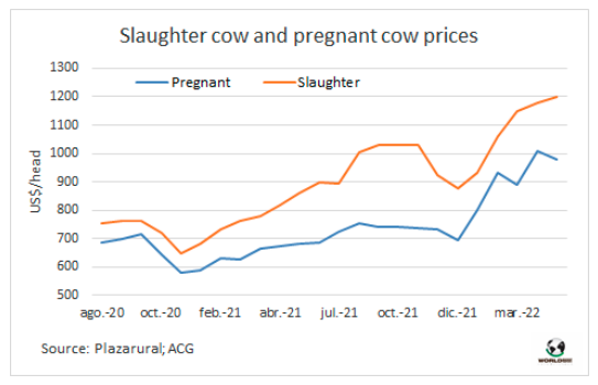 待宰牛價格高位并沒有導(dǎo)致懷孕母牛屠宰量的增加。根據(jù)WBR對3家屠宰企業(yè)進行的調(diào)查,懷孕母牛比例與前幾年相比沒有明顯變化。其中有兩家今年的占比比去年下降,而另一家占比沒有顯著差異。一頭230公斤的牛的價格約為1200-1250美元,而懷孕的牛的價格一般在950-1000美元之間。冬季開始時的良好飼料條件,以及對年中牛犢價格的樂觀預(yù)期使養(yǎng)牛戶決定將懷孕的母牛留在育種群中。