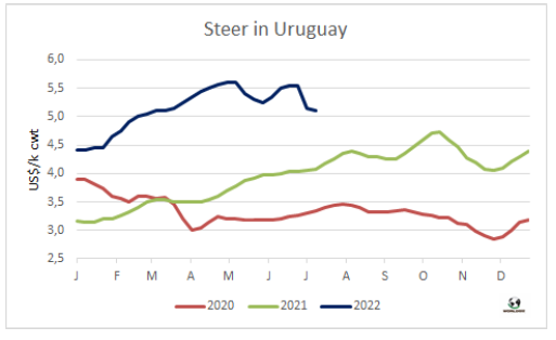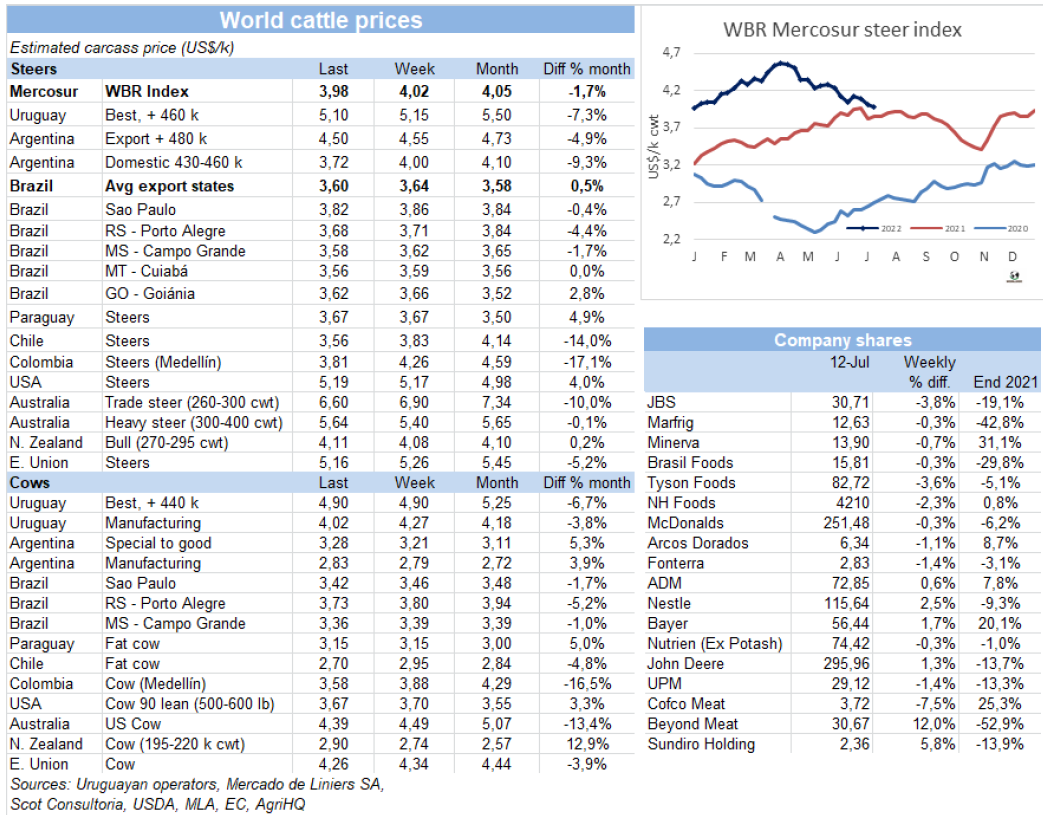 五家工廠暫停屠宰活動加上一些還在進(jìn)行屠宰活動的工廠減產(chǎn),導(dǎo)致牛屠宰量下降至2020年末至今一年半以來的最低水平。烏拉圭肉協(xié)報告,截止7月9日,一周內(nèi)牛屠宰量29829頭,環(huán)比減少了1萬多頭,減幅約25%。同比減少了2.1萬頭,減少了42%。屠宰量較上周下降是由于閹牛屠宰量下降了約28%至14561頭,母牛屠宰量較上周下降了17%至10506頭。小母牛屠宰量下降了17%至4297頭。屠宰量最高的工廠是Las Piedras,379廠,屠宰量 5022頭, Marfrig-Cledinor,394廠,屠宰量 3180頭和Ontilcor 439廠,屠宰量3,041頭。美麗華三家屠宰場屠宰量累計6553頭,Marfrig兩家屠宰場累計屠宰量5735頭。本周烏拉圭2廠,104廠等一些上周暫停的屠宰場恢復(fù)屠宰, 12廠,344廠,310廠仍未恢復(fù)屠宰。美麗華7廠屠宰持續(xù)至昨天,將暫停屠宰直至八月中旬。本周屠宰量將繼續(xù)保持低水平,不過將較前一周的低點有所提高。
