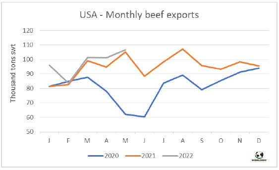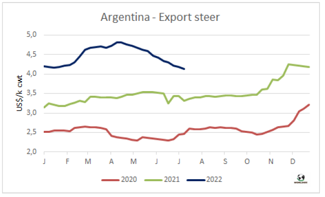 今年上半年,牛屠宰量達(dá)650萬頭,牛肉產(chǎn)量150萬噸,與2021年上半年相比分別增長了2%和4%。主要的出口加工商,占總屠宰量的29%。2021年7月至2022年六月屠宰量1310萬頭,比前一個遷移年減少了50萬頭(降幅-4%),比2019/20年同期減少了110萬頭(-8%)。