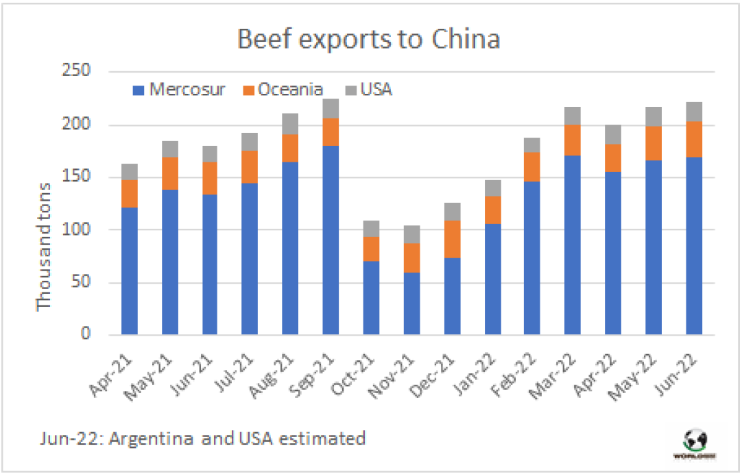 6月份,中國牛肉的主要供應(yīng)國發(fā)船量仍然很大。據(jù)估計,南方共同市場、澳洲和美國牛肉出口量達(dá)22.1萬噸,非常接近2021年9月22.4萬噸的最高峰值。據(jù)估計從南方共同市場發(fā)貨量約17萬噸,其中從巴西發(fā)貨量超過10.3萬噸。此外,從澳洲發(fā)貨量3.3萬噸,從美國發(fā)貨量1.8萬噸,與3-5月的出貨水平相當(dāng)。這些貨物量大多在7月下半月到8月之間抵達(dá)中國。