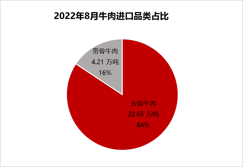 從牛肉進(jìn)口品項(xiàng)看,帶骨牛肉占比基本沒有變化。8月去骨牛肉進(jìn)口量22.65噸,占84%,帶骨牛肉進(jìn)口量4.21萬噸,占16%。
