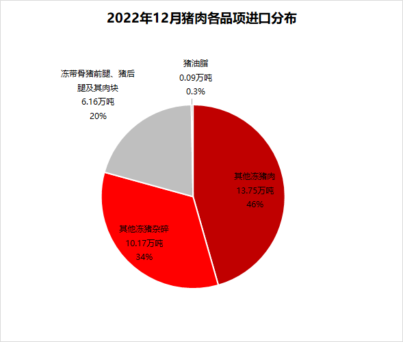12月豬肉進口品項以骨類和其他帶骨豬肉為主,占進口量的46%;豬副產類占比34%;主塊肉和油脂類占比共計20%。