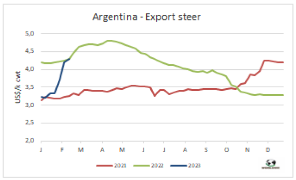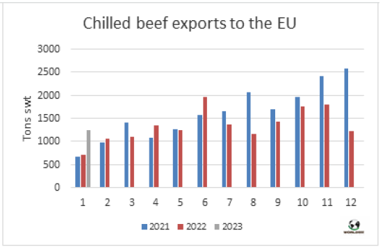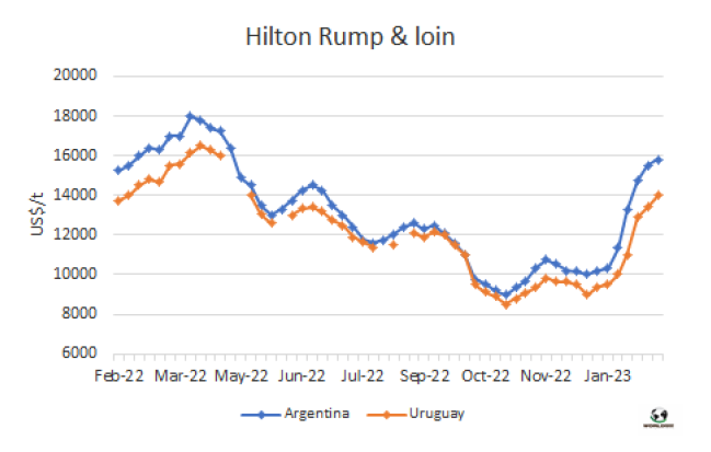 2023年開(kāi)年至今希爾頓配額內(nèi)冰鮮牛肉價(jià)格保持爆發(fā)式增長(zhǎng)節(jié)奏。上周阿根廷臀腰肉參考價(jià)15500-16200美元/噸,烏拉圭產(chǎn)品參考價(jià)14000美元/噸,一些進(jìn)口商擔(dān)心新冠疫情給市場(chǎng)帶來(lái)不確定性,本周初還價(jià)低于10000美元/噸,烏拉圭Marfrig的CEO上周表示歐洲市場(chǎng)表現(xiàn)出更強(qiáng)的活力,需求比幾個(gè)月之前更好了。