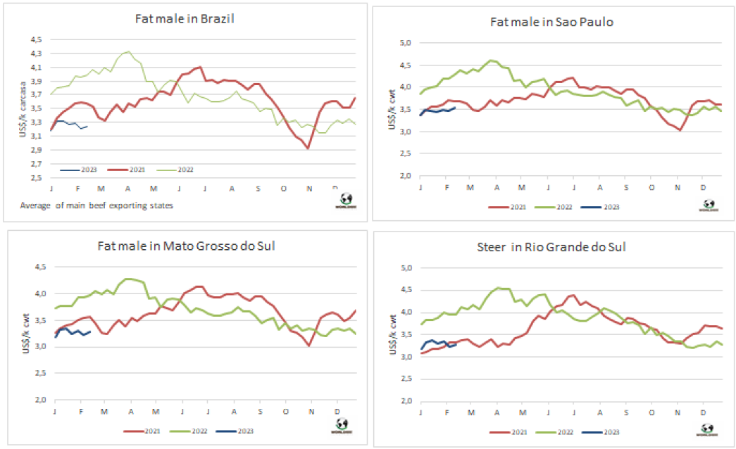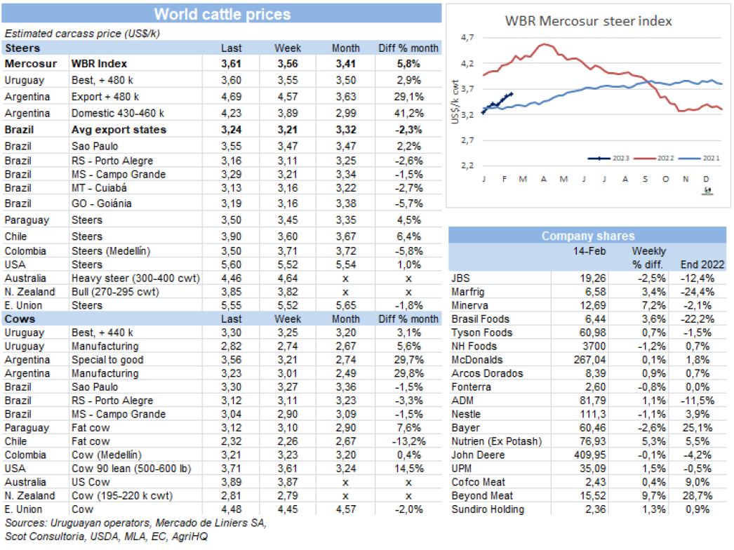 由于活牛價(jià)格急劇上漲,政府為控制不讓價(jià)格轉(zhuǎn)移到消費(fèi)端者身上,給屠企施壓。周一政府重新啟動(dòng)了一項(xiàng)“關(guān)愛(ài)肉”計(jì)劃,通過(guò)該計(jì)劃,企業(yè)必須承諾以低于當(dāng)?shù)厥袌?chǎng)30%左右的價(jià)格分銷七項(xiàng)部位肉。昨天,也就是周二,新加一項(xiàng)要求是這些公司必須每月貢獻(xiàn)1.5萬(wàn)噸的部位肉。由于牛肉是食品和飲料類別中權(quán)重最大的商品,占消費(fèi)者價(jià)格指數(shù)(CPI)的24%,經(jīng)濟(jì)部希望能影響2月的通貨膨脹率。與此同時(shí),政府還對(duì)海關(guān)和聯(lián)邦公共收入管理局施加壓力。政府發(fā)布的一份報(bào)告稱,他們發(fā)現(xiàn)“在2021年至2022年期間,523份牛肉出口許可證存在虛開(kāi)發(fā)票的操作”。報(bào)告指出,此類操作涉及22家出口商,“少開(kāi)發(fā)票”的總額為1190萬(wàn)美元(占這兩年出口額的0.2%)。一些公司本周無(wú)法獲得出口許可。此外,已經(jīng)廢除的2021年6月開(kāi)始實(shí)施的肉類出口配額也被恢復(fù)。這一配額最初為2.9萬(wàn)噸,并加上關(guān)稅配額,后來(lái)變得更加靈活,達(dá)3.9萬(wàn)噸,而現(xiàn)在又回到了原來(lái)的數(shù)量。就此而言,為了讓國(guó)內(nèi)市場(chǎng)獲得便宜的肉類,出口企業(yè)正在讓步,例如將針扒和肩胛排除在出口禁令之外,建立一個(gè)特殊的牛肉出口用匯率——比官方匯率高出1美元,以及只允許擁有屠宰場(chǎng)的公司授予出口許可證等其他要求。