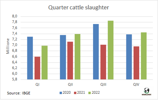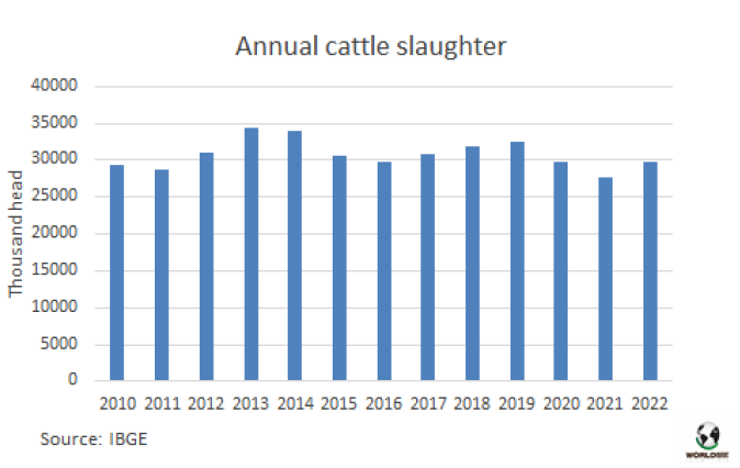 2022年巴西牛屠宰量小幅增長(zhǎng)約200萬(wàn)頭