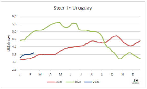 牛屠宰量連續(xù)五周增長(zhǎng),許多工廠為481配額加緊備貨。據(jù)烏拉圭肉協(xié)報(bào)告,截止一周內(nèi)牛屠宰量52432頭,較前一周增加了635頭,僅低于去年同期1200頭。481配額屠宰表現(xiàn)在閹牛的屠宰占比增大上。閹牛屠宰量29412頭,占總屠宰量的56.1%,與上周持平。小母牛屠宰量7456頭,較上周增長(zhǎng)了2%,母牛屠宰量14824頭,較上周增長(zhǎng)了3%。上周屠宰量最活躍的工廠是Las Piedras(379廠,5700頭),Marfrig-Tacuarembó (12廠,屠宰量5096頭),Minerva-pulsa(7廠,屠宰量4021頭)。美麗華3家工廠屠宰量10051頭,較上周增加了580頭。2月前11個(gè)工作日牛屠宰量共88260頭,較2022年同期減少了5.7%,1月屠宰量同比下降了27.8%。
