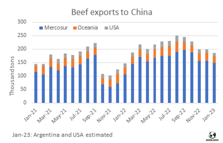 根據(jù)出口國(guó)的部分?jǐn)?shù)據(jù)估計(jì),中國(guó)牛肉市場(chǎng)的主要供應(yīng)國(guó)1月份對(duì)中國(guó)出口量約為18.5萬(wàn)噸。這是自1 2022年1月以來(lái)的最低,比去年8月(25.2萬(wàn)噸)減少了約6.6萬(wàn)噸。南方共同市場(chǎng)國(guó)家出口了約14.9萬(wàn)噸(阿根廷的數(shù)據(jù)為預(yù)估數(shù)據(jù)),而澳洲國(guó)家則向中國(guó)出口了2.6萬(wàn)噸。去年12月,美國(guó)向中國(guó)出口不到1.1萬(wàn)噸,預(yù)計(jì)1月份這一出口量不會(huì)大幅增長(zhǎng)。
