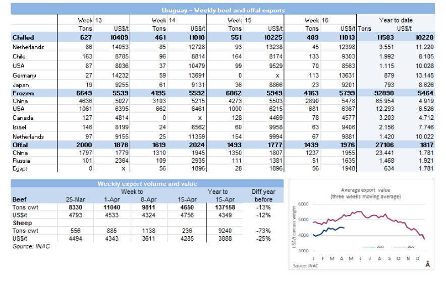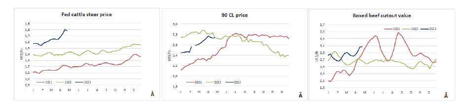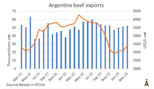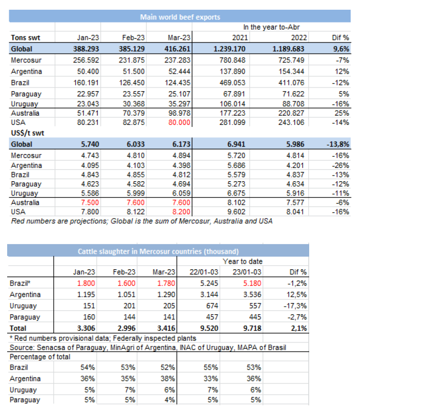2023年前三個月,牛肉出口量達到15.6萬噸,出口額為6.542億$,與上年同期相比增長13.2%,出口額下降16.4%。本季度的出口量相當于22.18萬噸帶骨牛肉。