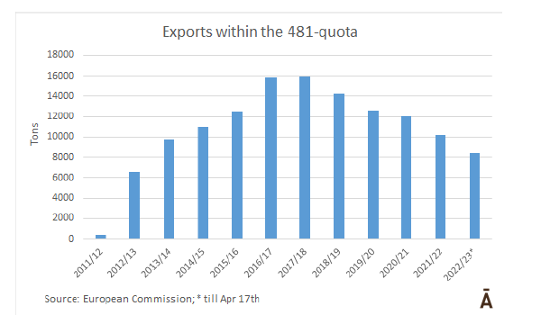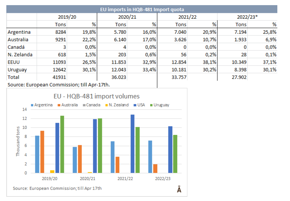 烏拉圭是第二大供應(yīng)國,在2022-2023年度達到8,398噸,超過了阿根廷(7,194噸)和澳大利亞(1,933噸)。新西蘭和加拿大可以給481配額出口,但他們并沒有使用配額。