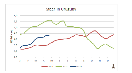 在烏拉圭出口閹牛報價為繼續(xù)穩(wěn)定在4.30$/kg cwt。