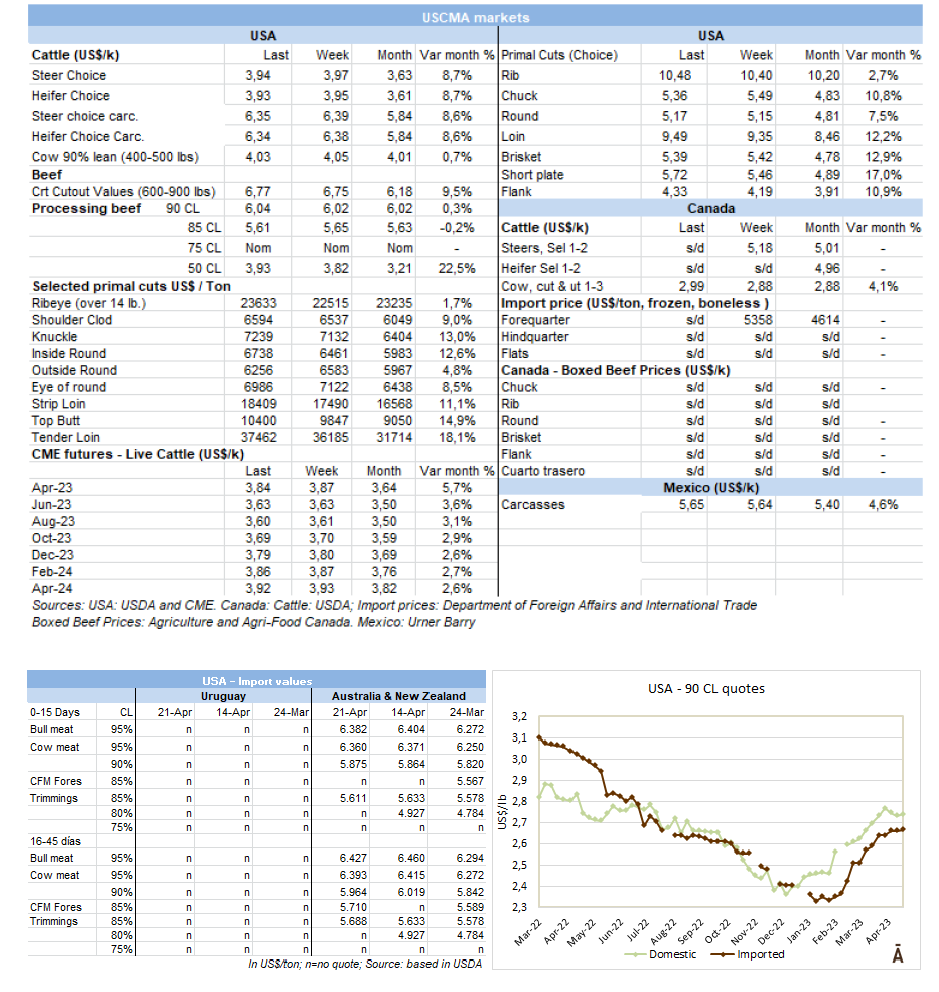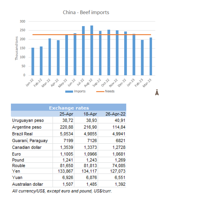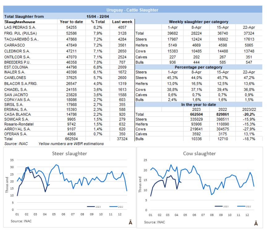 在僅剩的一周時間里,4月份累計只屠宰了105,343頭牛,因此該月傾向于以不到150,000頭動物的加工量結(jié)束,在年度比較中減少了約65,000頭。這樣一來,今年前四個月的牛屠宰量將剛剛超過70萬頭,比2022年同期減少約18萬頭(-21%)。