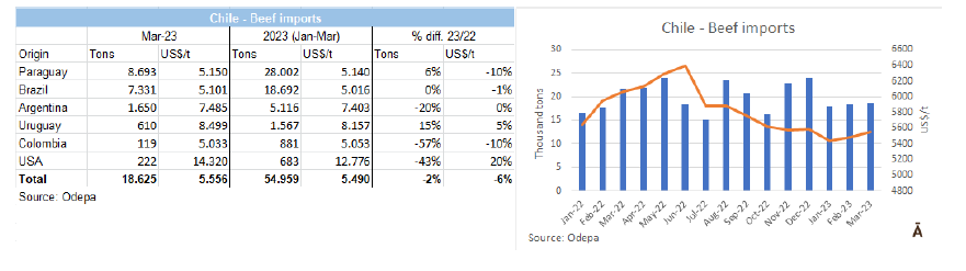 根據(jù)Odepa公布的數(shù)據(jù),智利在2023年前三個月進口了54,959噸牛肉,均價為$5,490/噸。數(shù)量同比收縮2%,而價值中值下降6%。