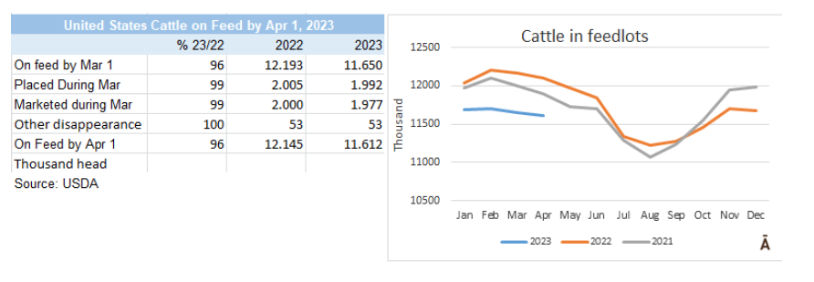 美國農(nóng)業(yè)部統(tǒng)計4月牛存欄量為1160萬頭牛,同比去年下降了4.4%。3月期間的投放量共計199萬頭,比去年低1%。3月期間飼用牛的銷售量總計198萬頭,比2022年低1%。庫存包括712萬頭閹公牛,同比下降6%,450萬頭小母牛,同比下降2%。