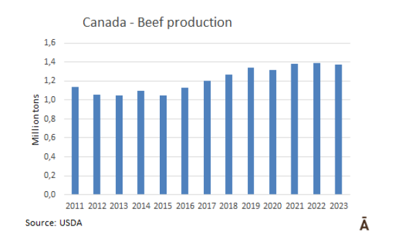 美國農(nóng)業(yè)部預(yù)計2023年加拿大牛肉產(chǎn)量為137.5萬噸,比2022年減少2萬噸。