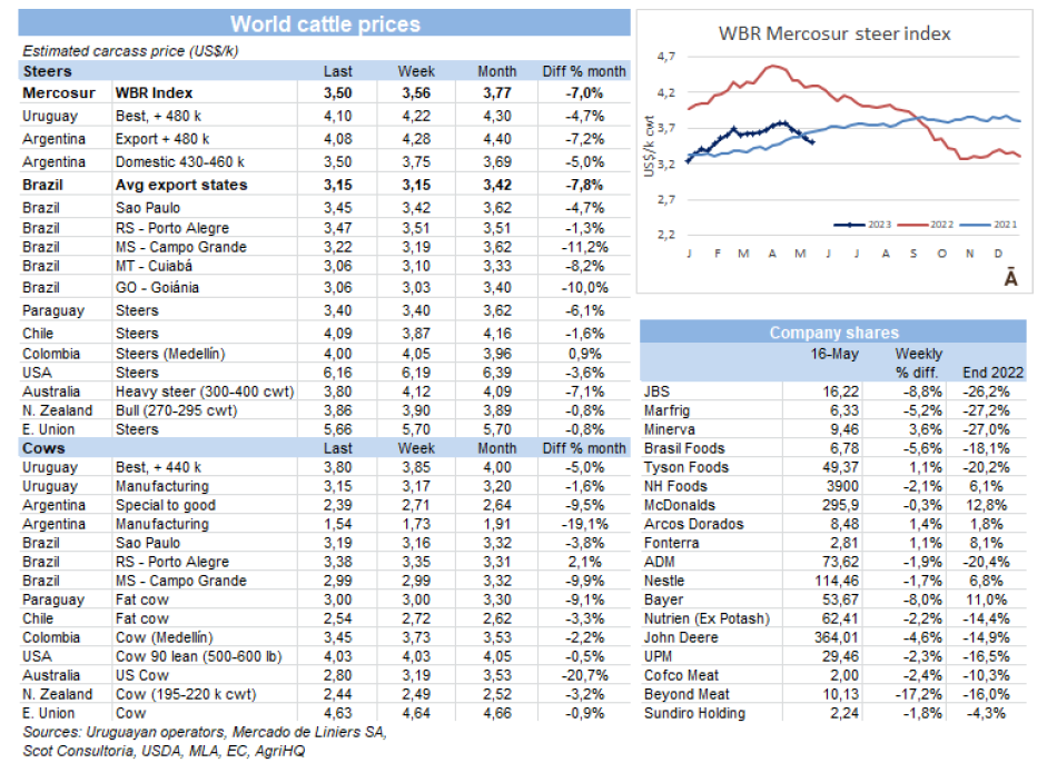 世界牛肉報(bào)告 Mercosur 牛肉指數(shù)在上周再次下跌,在下跌6美分后,定格在每公斤3.50美元,這是一月底以來(lái)的最低水平。雷亞爾兌美元的升值則抑制了巴西牛價(jià)格的下跌。