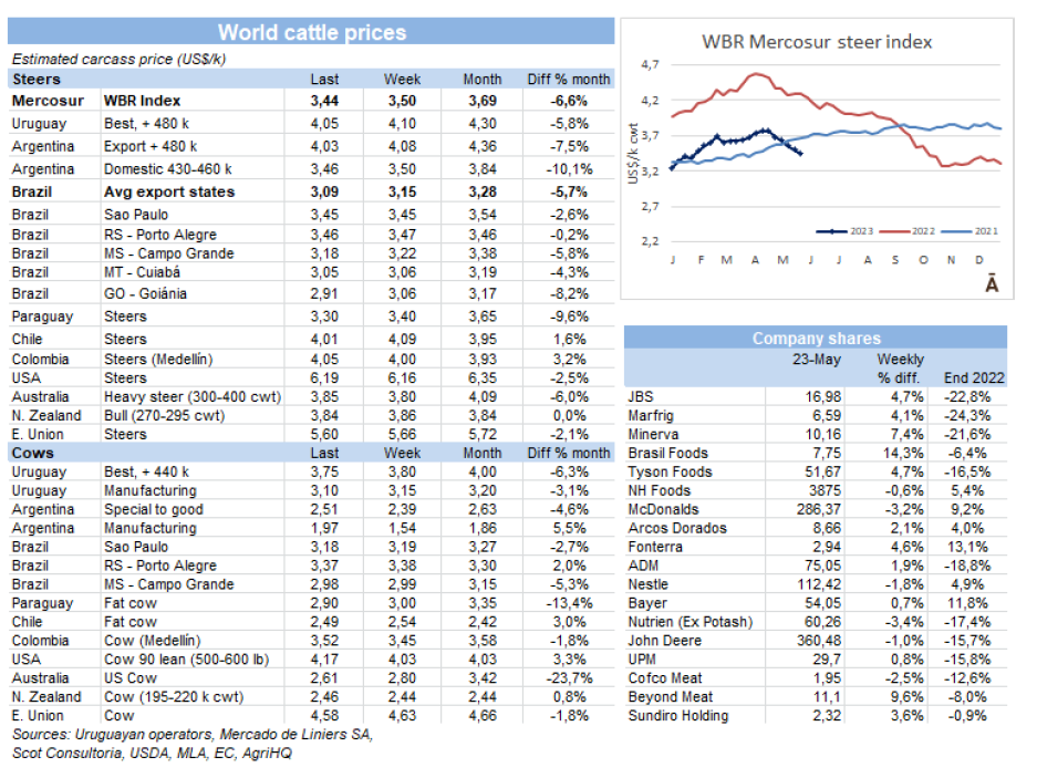 關于烏拉圭肉類綜合企業(yè)面臨的供應條件,Secco說,在活動方面是最可預測的,因為 "我們知道沒有什么"。冬季屠宰量的下降可能仍然高于一年中的20%,這是經(jīng)歷過的干旱情況導致的結果,而且旱情仍無法解決。供應量將很少,主要市場的需求沒有活力,巴西提供更便宜的牛肉價格,所以我們知道將經(jīng)歷一個市場寒冬,在低供應和市場之間試圖重新調整。牛的價格與出口價格有很高的關聯(lián)性。他預計在未來幾個月里的出口價約為$4,200-$4,300/噸,這將導致牛的價格 "低于每公斤胴體$4"。