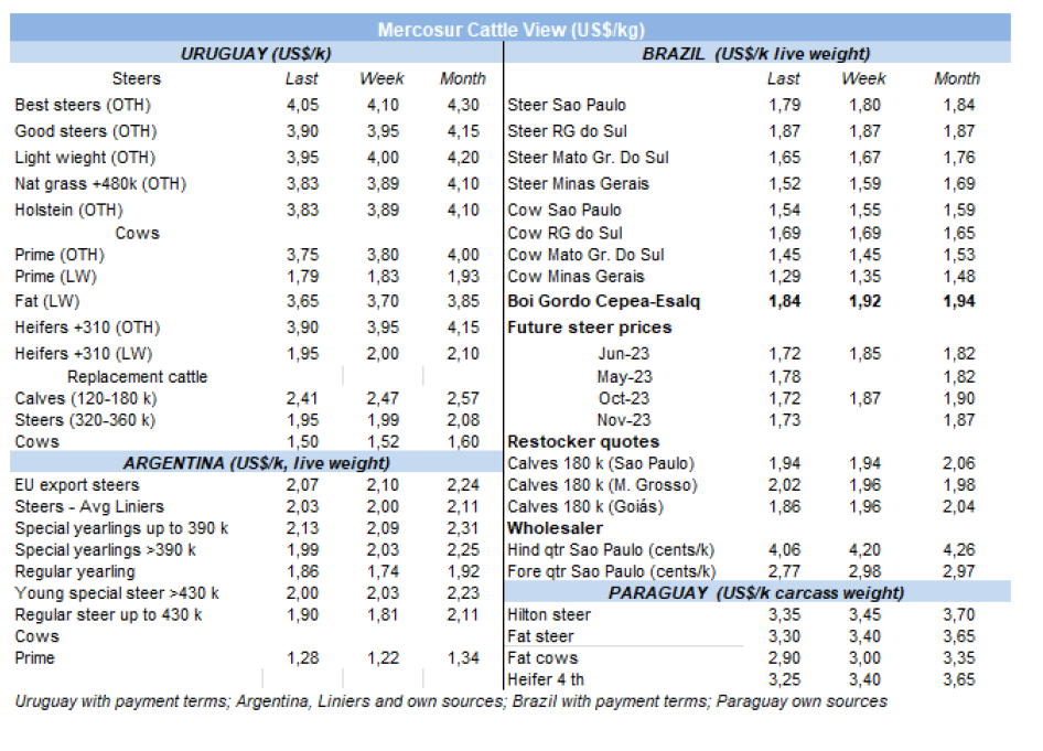 世界牛肉報告稱閹牛指數(shù)連續(xù)第5周下跌,本周再次下跌6美分至每公斤$3.44。巴西各出口州的牛價平均下跌1.7%至每公斤$3.09。烏拉圭、阿根廷和巴拉圭的成品牛價格也有下跌。