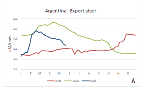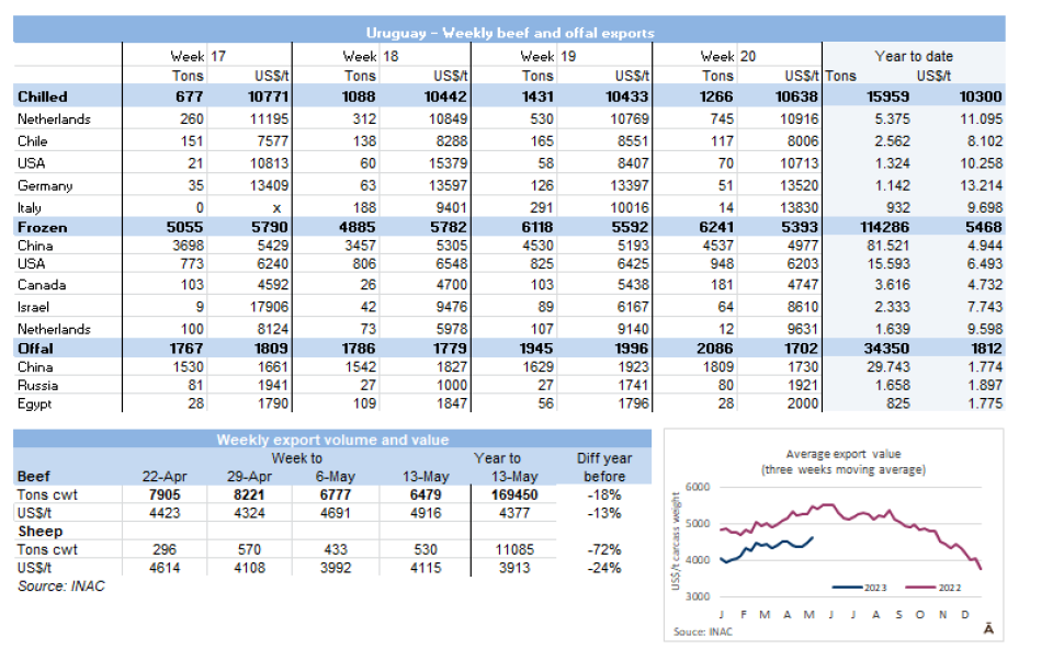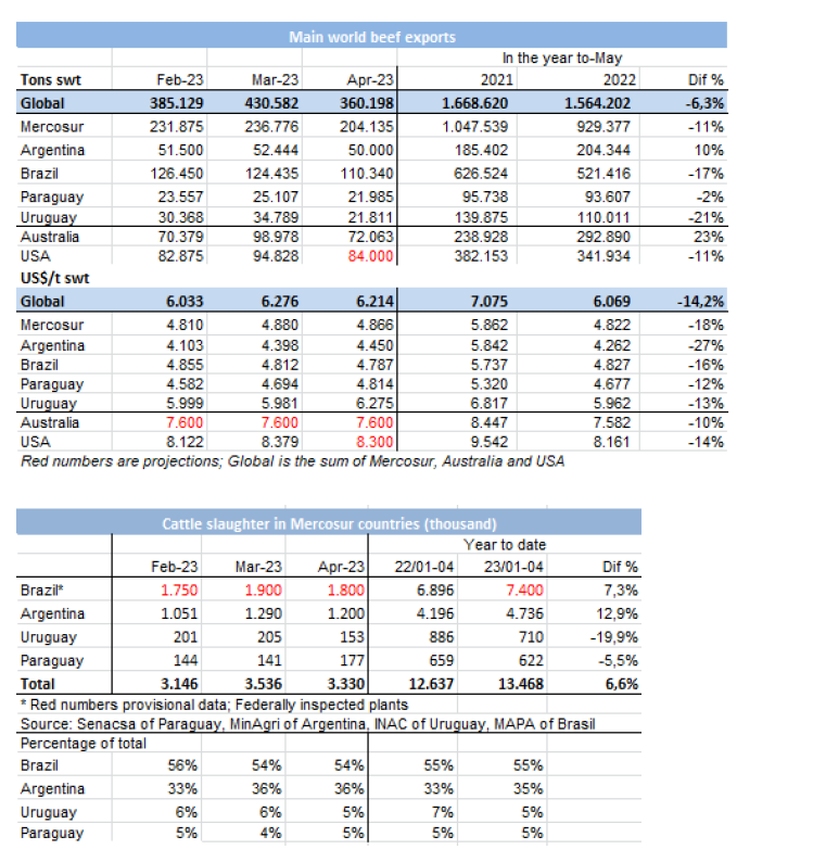 在2023年前四個月,牛肉出口總量為21萬噸(產(chǎn)品重量),價值接近8.95億美元,這一數(shù)字意味著數(shù)量上同比增長13.4%,同時貨值下降17.3%,中國占了發(fā)貨量的77.4%。去年(從2022年5月至2023年4月),肉類出口總量為65.8萬噸產(chǎn)品重量(相當于938,500噸帶骨牛肉),價值接近32.73億美元。