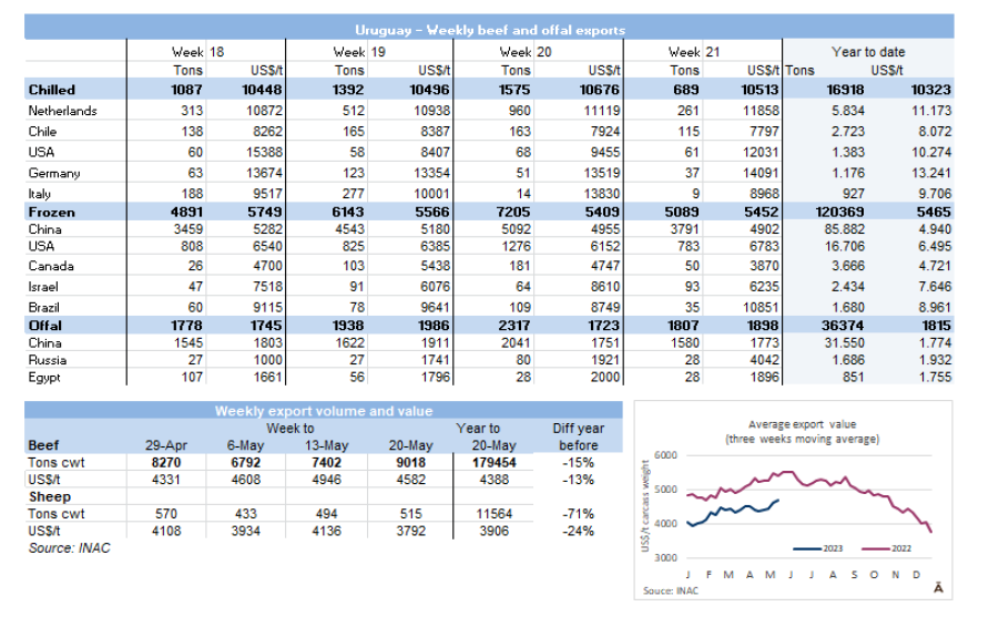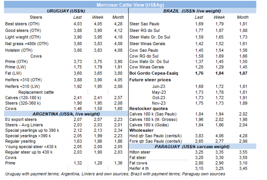 cwt,跌至1月以來(lái)最低水平。由于巴西價(jià)格大跌(-8%),加上巴西貨幣雷亞爾的貶值,巴西出口州的平均牛價(jià)由$3.09/kg cwt跌至$2.92/kg cwt。烏拉圭和阿根廷的市場(chǎng)的價(jià)格下降幅度要小得多。