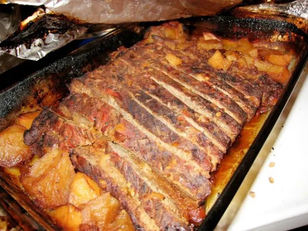 那具體怎么烹制呢?首先剔除多余的脂肪,然后用口急汁、鹽、黑胡椒碎、牛至葉等均勻涂抹于牛前胸肉,然后用錫紙包裹起來進行腌制一夜,烤制前還可用針管注入由牛肉湯、黃油、醬油等調(diào)的醬汁,然后放在炭火上,加果木,以120℃-125℃烤,熏烤期間可噴適量蘋果醋,熏烤八九個小時后,取出前胸肉,用錫紙包裹好再放入烤爐中。包裹錫紙一是為了減少牛前胸肉內(nèi)部水分流失,二是使熱量集中,節(jié)省烤制時間。