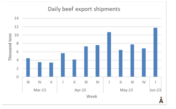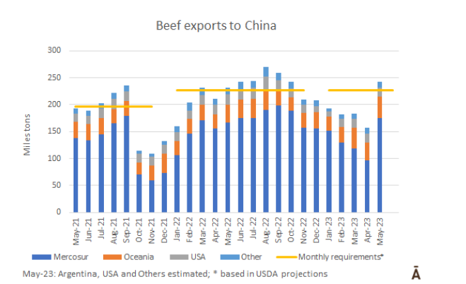 據估計,5月份約有24萬噸牛肉運往中國,這一數量將超過他們每月的需求量(估計為22.5-23萬噸)。自去年10月以來,出貨量一直低于需求量。