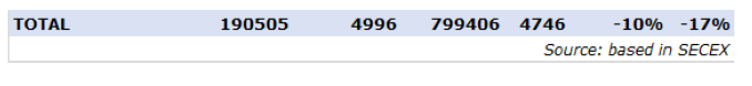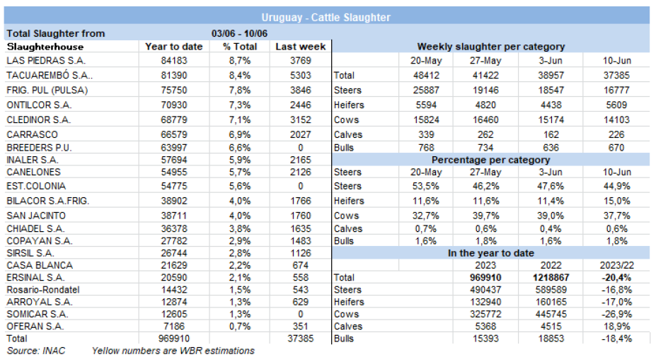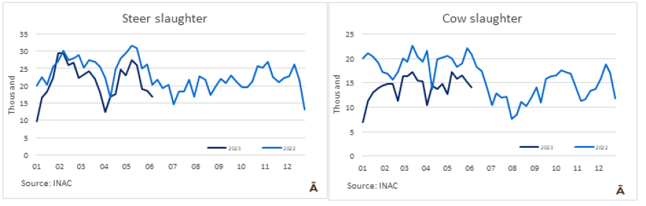 屠宰量前三的工廠是是12廠(5303頭)、7廠(3846頭)和379廠(3769頭)。Marfrig有三個比較活躍的工廠,共屠宰了10,620頭牛,而Minerva也有三個工廠,共屠宰了7999頭牛。到目前為止,6月份已經屠宰了54,011頭牛,比2022年同期減少33%。