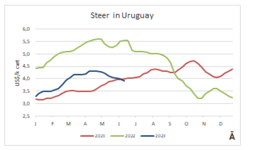 烏拉圭閹牛本周價格下降$0.10至$3.90/公斤。