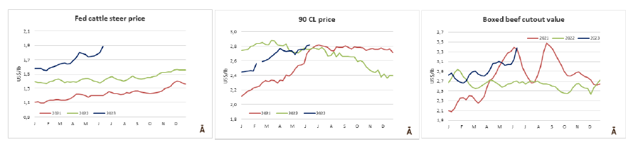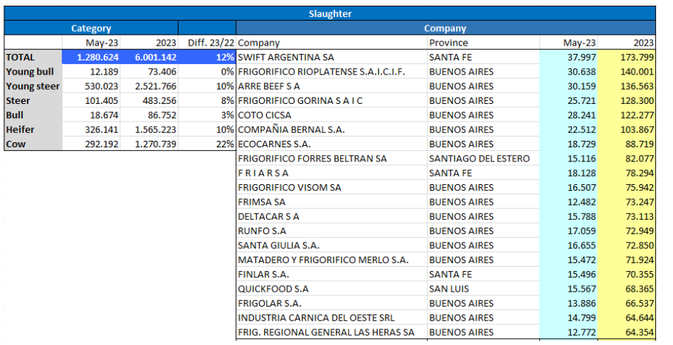 根據官方數據顯示5月份屠宰了128萬頭牛,比上個月增長了近9%,年度增長率略高于10%。按工作日計算,5月份的屠宰量超過去年4月份總量的3%,比2022年5月的屠宰量高出16%。雖然在這兩方面的比較中都有增長,特別是同比增長,但與上個月相比有所下降,當時日屠宰量在每月比較中增長11%,同比增長18%。在2023年的前五個月,牛的屠宰量超過了2022年同期。今年共有600萬頭牛被屠宰,比去年同期多12%。