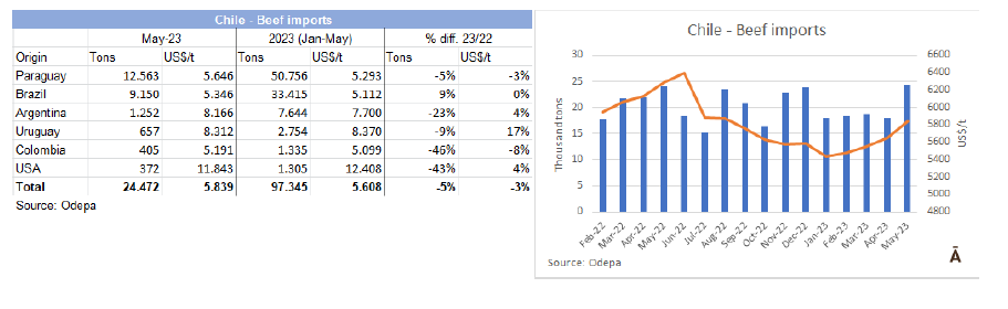 2023年前5個月智利進口了97345噸,均價$5608/噸;數量同比下降5%,中值收縮3%。