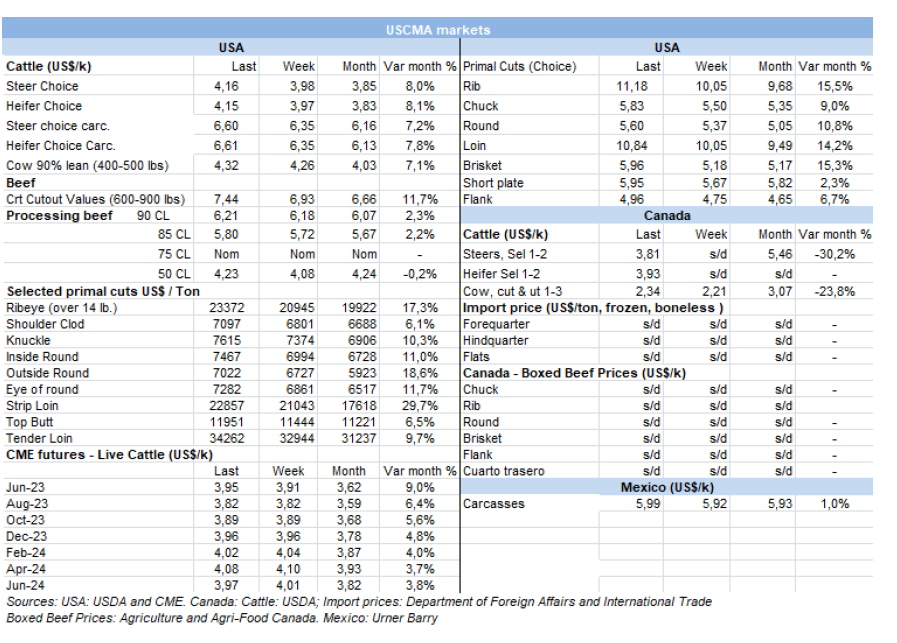 作為美國牛肉和各種肉類的主要目的地,墨西哥匯率和強勁的餐飲服務需求推動了4月份的出口總量達到14403公噸,比2022年增長10%,而價值增長18%,達到8180萬美元。2023年前四個月對墨西哥的出口增長14%,達到64,912公噸,價值為3.654億美元(增長17%)。