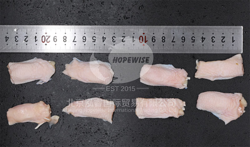 現(xiàn)在不用這么麻煩了,我們泓睿有現(xiàn)成分割好的雞腳筋——紅太陽雞腳筋。每包重2kg,解凍后去除冰水,剩余凈重1.86kg,失水率約7%。