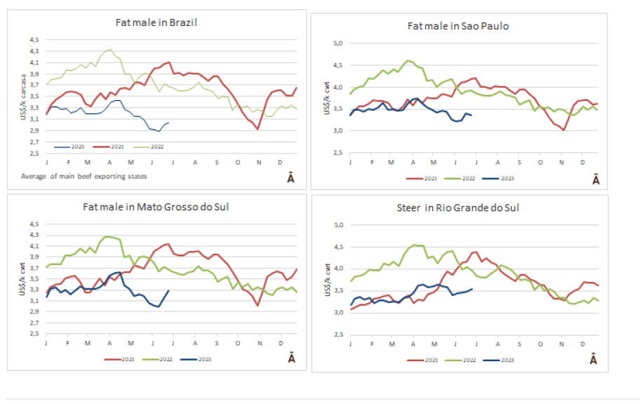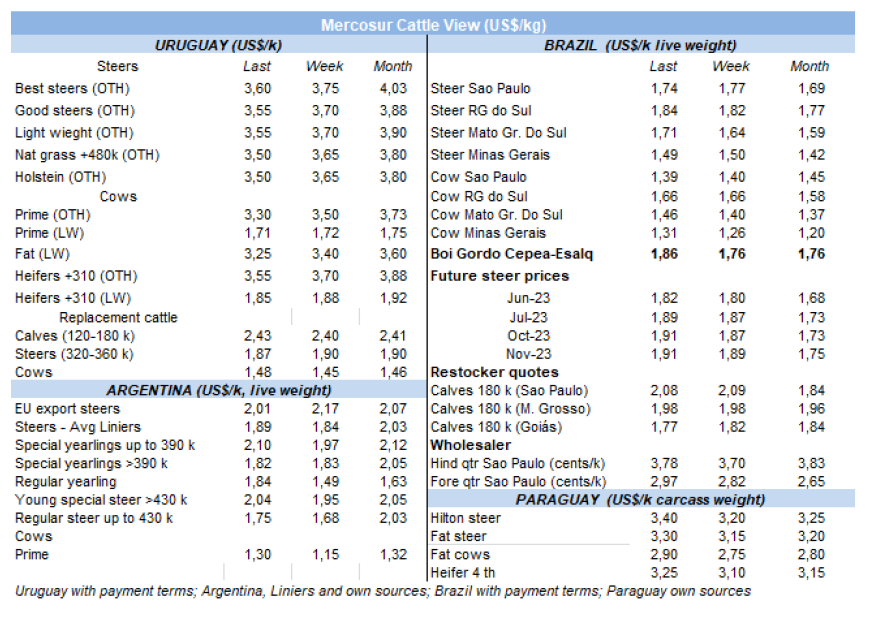 隨著阿根廷和烏拉圭的公牛價格下降,巴西和巴拉圭的公牛價格上升,該地區(qū)牛的屠宰價格差距縮小了。