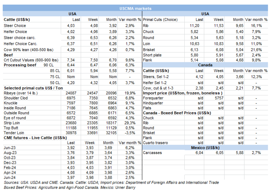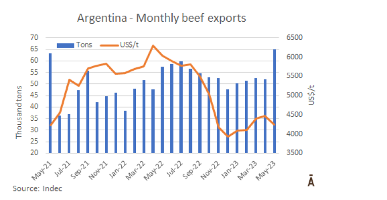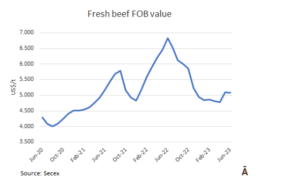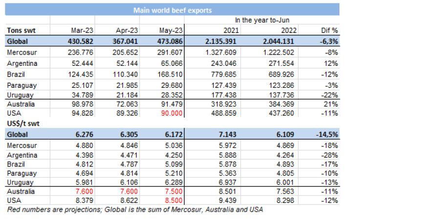 5月份出口的金額為2.765億美元,比上個月增加16.4%,比2022年5月減少20.4%。牛肉的均價為每噸$4250,月度同比下降4.9%,年度同比下降29.6%。