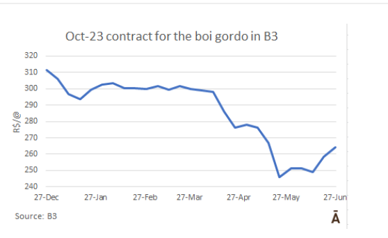 南馬托格羅索州和馬托格羅索州的上調(diào)幅度比較大,分別為R$10和R$5。在期貨市場,10月23日boi gordo合約在經(jīng)歷了4月初和5月下半月的大幅下跌后正在恢復(fù),當(dāng)時它從R$300下跌到R$250(-18%)。從那時起,它已經(jīng)恢復(fù)了約R$18。達(dá)到R$264。與圣保羅價格相比,該合同的溢價超過R$20。
