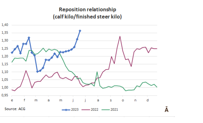 在2021年7月-2022年6月期間,由于歷史上成品牛價格高,替代率非常接近1比1的水平。去年下半年開始,這種情況開始改變,當(dāng)時屠宰用動物的價格出現(xiàn)了強(qiáng)烈的調(diào)整,而這種調(diào)整并沒有完全轉(zhuǎn)移到其他類別。