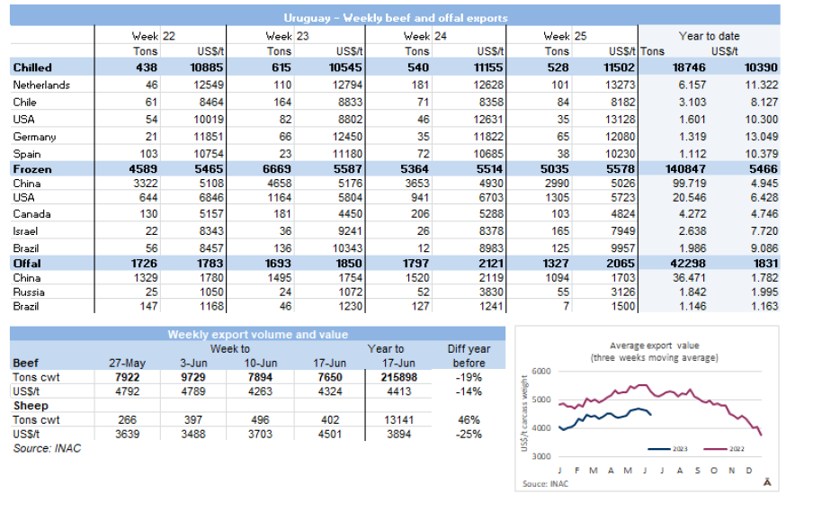 雖然與中國的羊肉市場仍然 "非常低迷",9-24公斤羊肉的出價不超過每噸$3300,但一家烏拉圭出口商以$3500完成了一次交易。該消息人士指出,雖然它的價格與中東地區(qū)相似,但它的物流和文件成本較低,是一個 "更好的選擇"。一位交易商評論說,烏拉圭的其他行業(yè)至少需要$3900才能完成羊肉交易。