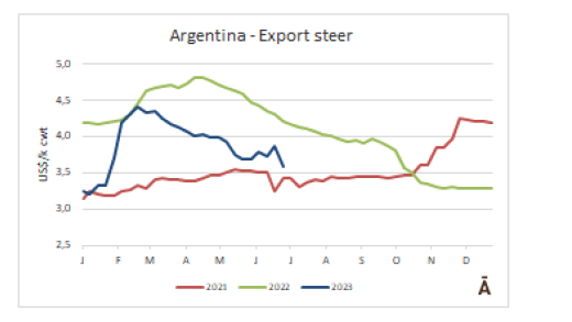 阿根廷本周出口公牛的價格大幅下降到$3.91/公斤(包含了9%的出口稅),每周下降31美分(7.3%)。