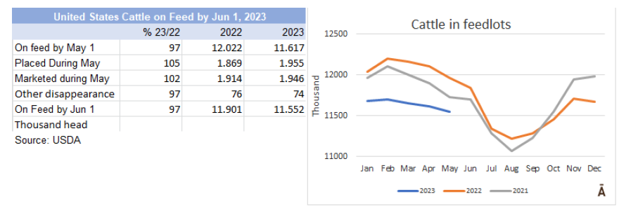 2023年6月1日,產(chǎn)能在1000頭以上的飼育場中的牛群總數(shù)為1160萬頭,比去年同期下降3%。5月份的投放量為196萬頭,比2022年高出5%。市場銷售總量為195萬頭,比去年高2%。
