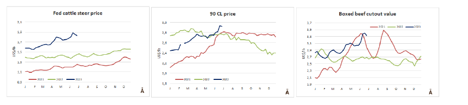 在過去的兩個月里,肥牛價格再次下跌。出口肥牛參考價格從4月底的$4.30/公斤下降到本周的$3.73/公斤,下降了13%。同時,小牛的價格從$2.51/公斤降至$2.43/公斤,僅損失3%。