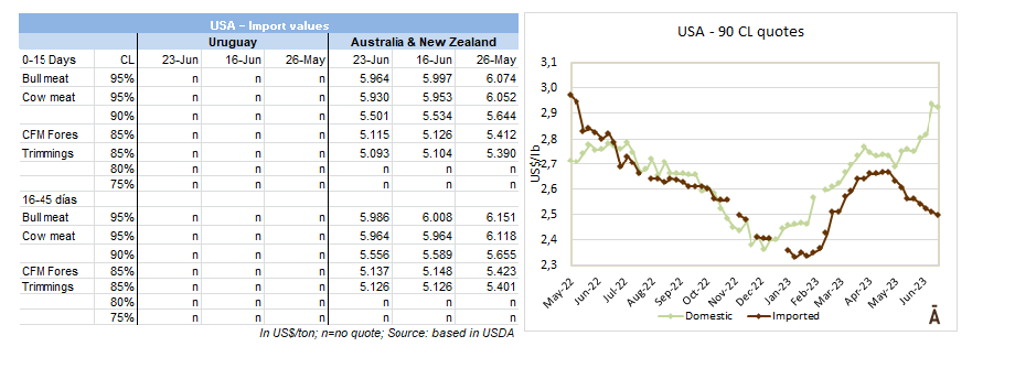 在7月4日的獨(dú)立日假期之前,本周美國進(jìn)口市場略顯平靜。澳大利亞大量出口肉類,占據(jù)市場主導(dǎo)地位。配額外的90牛前參考價格為$4000(CFR),95牛前的參考價格為$4200。