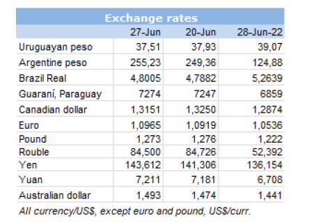 無論如何,阿根廷仍是該地區(qū)價格最高的國家,其次是烏拉圭,其價格趨勢也是向下的。本周的出口價格下降了15美分,為$3.60/公斤。